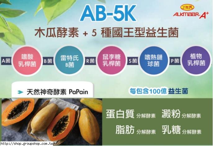 五種國王型專利活性益生菌(每包2克含100億活菌)+木瓜酵素。能維持腸道機能、調節腸道菌叢生態、使排便順暢!消化不卡卡、肚子沒有氣、大魚大肉沒在怕。ㄚ克瑪為您的健康加碼。